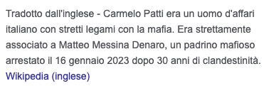 Aldo Grasso, da par suo, ha raccontato l’ennesima e poco edificante storia della malagiustizia tricolore e fatto tutte le sue doverose e sacrosante proteste, lamentele e simili, incorrendo a mio avviso solo in una omissione poco onorevole, questa volta, per la nostra professione: la scarsa o nessuna evidenza data dalla generalità della stampa e, più in generale, dell’informazione alla vicenda. Poco fa -per darvene un esempio- ho sbirciato Geoogle e ho trovato la seguente traduzione dall’inglese di Wikipedia: “Carmelo Patti era un uomo d’affari italiano con stretti legami con la mafia. Era strettamente associato a Matteo Messina Denaro, un padrino mafioso arrestato il 16 gennaio 2023 dopo 30 anni di clandestinità”. Punto e basta.