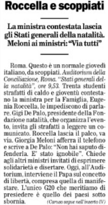 Lo hanno detto alcuni esponenti del Pd dissentendo da altri compagni di partito. Lo hanno ripetuto nel salotto televisivo di Lilli Gruber il più volte ex direttore del Corriere della Sera Paolo Mieli e Andrea Scanzi, del Fatto Quotidiano. E lamentato il titolista del manifesto scrivendo nel sommario, naturalmente di prima pagina: “Apriti cielo. Lei se ne va e parte un coro sdegnato, cui si unisce il presidente Mattarella: i “censori” sarebbero gli studenti”. E non quindi la Roccella e i solidali con lei, fuori e dentro l’auditorium dove tutto è accaduto, a due passi dal Vaticano e dal Papa, peraltro atteso oggi nello stesso posto, si spera accolto un po’ meglio.