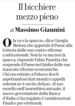La colpa di Panetta sarebbe a monte, diciamo così. La sua scommessa sul destino per niente declinante dell’Italia, che è nella “crescita” vantata da Libero diretto dall’ex portavoce di Palazzo Chigi Mario Sechi, come ricordano o gli rinfacciano spesso nel salotto televisivo di Lilli Gruber che lo invita spesso per le sue edizioni di tutti contro uno; la colpa di Panetta, dicevo, è di essere arrivato al vertice della Banca d’Italia dopo essere stato corteggiato dalla Meloni come ministro dell’Economia.