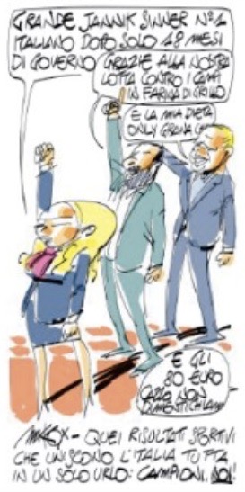 Vicino, quanto meno, al paradosso del nuovo numero uno del tennis sbandierabile come un trofeo dalla Meloni, già espostasi di recente in altre occasioni sportive mescolandole alla sua campagna elettorale, si è già spinto quel diavolo di Makkox con una vignetta sul Foglio in cui la premier esulta per il successo di Sinner e del tennis italiano arrivato “dopo solo 18 mesi di governo”.
