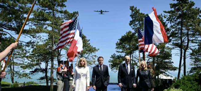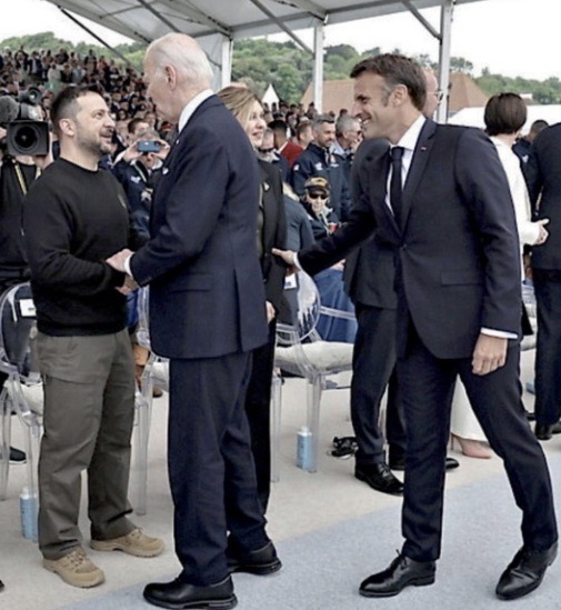La foto più significativa delle celebrazioni in Normandia è quella del presidente americano Joe Biden che saluta paternamente il presidente ucraino Zelensky riconoscente e fiducioso, e del presidente francese Macron che contemporaneamente ne saluta la moglie.