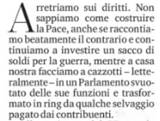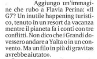 Il direttore della Stampa ha voluto “rubare” il passaggio di un articolo della sua giornalista Flavia Perina, peraltro già direttrice del Secolo d’Italia, storica testata della destra italiana, per contestare la scelta di “un resort da vacanza” per un vertice internazionale “mentre il pianeta fa i conti con tre conflitti”. “Non dico -aveva scritto la Perina mandando Malaguti in brodo di giuggiole- che i Grandi dovessero andare a Yalta o in un convento. Ma un filo in più di gravitas avrebbe aiutato”.