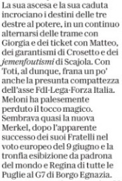 E’ un po’ anche quello che si aspetta il direttore di Repubblica in persona, Maurizio Molinari, avendo titolato il suo commento all’attacco di Meloni: “Se Giorgia si allontana dall’Europa”.