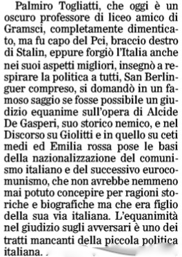 L’intervento di Giuliano Ferrara ha un valore doppio per la provenienza familiare e personale del fondatore del Foglio dal comunismo italiano. E per la sua conoscenza senza pari del più storico dei segretari del Pci, Palmiro Togliatti, che gli spetta per essere “cresciuto sulle sue ginocchia”, come diceva di lui Bettino Craxi ricordando che la madre ne era stata la segretaria più di fiducia. E il padre, prima ancora che senatore del Pci, corrispondente dell’Unità da Mosca diventandone poi direttore. Ed è proprio a Togliatti, un po’ pentito degli improperi riservati in passato ad Alcide De Gasperi, che Giuliano si richiama per reclamare, a favore della Meloni, “equanimità nel riconoscimento degli avversari”.