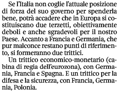 Piuttosto che togliersi qualche sassolino dalle scarpe o inseguire solo postazioni importanti nella Commissione di Bruxelles, dopo essere riuscita a portare la sua amica e collega di partito Antonella Sberna su una delle 14 poltrone di vice presidente del Parlamento europeo, la Meloni dovrebbe guardarsi secondo Monti dal pericolo di rimanere fuori dai “due terzetti” che incombono sull’Italia, “obiettivamente deboli -.ha riconosciuto il senatore- ma anche sgradevoli per il nostro Paese. “Accanto a Francia e Germania, che pur malconce, restano punti di riferimento, si formeranno -ha scritto Monti- due trittici: Un trittico economico-monetario (cabina di regia dell’Eurozona), con Germania, Francia e Spagna. E un trittico per la difesa e la sicurezza, con Francia, Germania, Polonia”.