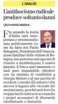 Ha scritto bene sulla prima pagina della Stampa nella sua “analisi” il professore Giovanni Orsina, che spero non rischi per questo né la cattedra universitaria né la collaborazione al giornale storico di Torino e poi anche della famiglia Agnelli: “Fin quando la storia d’Italia sarà interpretata e strumentalizzata politicamente come ha fatto ieri Paolo Bolognesi, Presidente dell’Associazione familiari delle vittime di Bologna, non potremo mai sperare di riuscire a metabolizzare il nostro passato. E fino a quel momento -ha insistito Orsina- sarà pure impossibile chiedere con un minimo di credibilità a Giorgia Meloni e al suo partito di recidere i residui fili emotivi che ancora li legano alle vicende del neofascismo, perché sarà loro fin troppo facile sottrarsi accusando i propri accusatori di disonestà intellettuale e faziosità”.