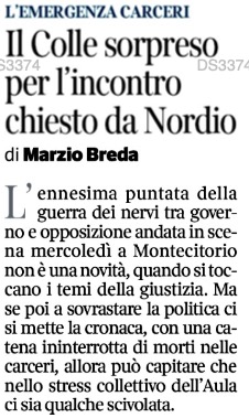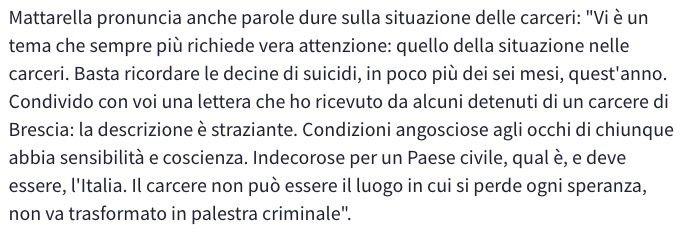 “Vi è un tema -ha detto testualmente il capo dello Stato in quell’occasione- che sempre più richiede una vera attenzione: quello della situazione nelle carceri. Basta ricordare le decine di suicidi, in poco più di sei mesi, quest’anno. Condivido con voi una lettera che ho ricevuto da alcuni detenuti di un carcere di Brescia: la descrizione è straziante. Condizioni angosciose agli occhi di chiunque abbia sensibilità e coscienza. Indecorose per un Paese civile qual è e deve essere l’Italia. Il carcere non può essere il luogo in cui si perde ogni speranza, non va trasformato in palestra criminale”.