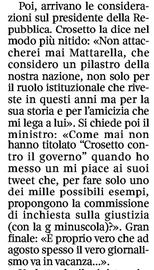 A e di chi ha potuto soltanto immaginare, dopo parole del genere, un fastidio del capo dello Stato ad una richiesta di parlarne da parte del Guardasigilli si può dire che “il vero giornalismo in agosto va in vacanza”, come ha dichiarato il ministro della Difesa Guido Crosetto commentando i retroscena che hanno attribuito anche a lui divergenze con Mattarella sulla giustizia e dintorni.