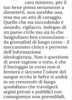 Non credo che abbia esagerato il direttore del Giornale Alessandro Sallusti a consigliare oggi all’amico ministro e collega di dimettersi davvero con “un atto di coraggio” per cercare di sottrarsi ad “un linciaggio che non si fermerà”. “Siccome l’odore del sangue eccita le belve- ha scritto ancora l’amico e collega di Sangiuliano- si andrà in un crescendo di fango quotidiano che travolgerà argini privati e pubblici con conseguenze non prevedibili”.