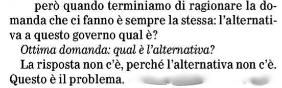 “Quando terminiamo di ragionare -ha detto ancora De Luca riferendo dei rapporti con gli elettori- la domanda che ci fanno è sempre la stessa: l’alternativa a questo governo qual è?” “L’alternativa non c’è”, ha risposto da solo aggiungendo che “questo è il problema”. Appunto.