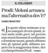 Prodi ha ricordato a distanza alla sua amica Elly Schlein -che esordì politicamente promuovendo l’occupazione delle sedi del Pd quando l’ex premier mancò l’obiettivo del Quirinale per i “franchi tiratori” del Nazareno nella votazione parlamentare- chiedendole: “Ma l’alternativa dov’è?”. “Nel governo -ha detto Prodi- sono emersi fenomeni di scollamento e di tensione ma poi, quando abbiamo letto gli opionion polls, abbiamo scoperto che la maggioranza tiene”, al contrario della Schlein che nei sondaggi è risultata penalizzata.