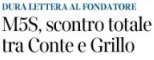 Lo scambio di minacce e scomuniche in posta elettronica certificata fra il presidente del movimento pentastellato e il fondatore, garante, elevato, sopraelevato e quant’altro è stato rappresentato impietosamente nelle prime pagine che hanno trovato uno spazio da dedicargli. “Totale” è stato definito questo scontro dal Corriere della Sera, che gli ha offerto pure il solito caffè di Massimo Gramellini, amaro per entrambi ma alla fine liquidatorio con quello che ha chiamato nel titolo “Il Conte del Grillo”.