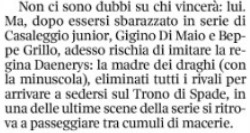 “Non ci sono dubbi su chi vincerà: lui”, ha scritto Gramellini di Conte, appunto. Aggiungendo: “Ma, dopo essersi sbarazzato in serie di Casaleggio junior, Gigino Di Maio e Beppe Grillo adesso rischia di imitare la regina Daenerys: la madre dei draghi (con la minuscola), eliminati tutti i rivali per arrivare a sedersi sul Trono di Spade, in una delle ultime scene della serie si ritrova a passeggiare tra cumuli di macerie”.