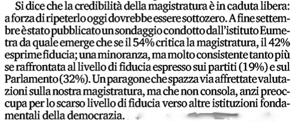 Bruti Liberati non ha dubbi che le competenze nella gestione dell’immigrazione irregolare non appartengano tutte al governo che le rivendica, almeno nella individuazione dei paesi sicuri dove potere almeno tentare di rimandare chi è sbarcato in Italia da clandestino. E, in polemica con quanti, fra i quali un altro ex magistrato che ora è ministro della Giustizia, Carlo Nordio, richiamano le toghe a riflettere sulla popolarità che esse hanno perduto da quando hanno preso a disturbare il manovratore politico, Bruti Liberati ha opposto un sondaggio effettuato nello scorso mese di settembre dall’Istituto Eumetra. Da cui risulta che davvero il 54 per cento del pubblico critica la magistratura, contro il 42 per cento che continua a riservarle fiducia. Ma è “una minoranza -ha avvertito Bruti Liberati, come per rivendicare il diritto degli ex colleghi di irrigidirsi- molto consistente, tanto più se si raffrontata al livello di fiducia espresso sui partiti (19%) e sul Parlamento (32%)”.