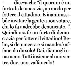 Ma sotterrarle come? Con una votazione di risultato opposto, rovesciato, a favore di Grillo e contro Conte? No. Solo puntando alla mancanza del cosiddetto quorum di partecipazione alle urne: lo stesso che il medesimo Grillo definiva a suo tempo “un furto di democrazia per fottere il cittadino”.