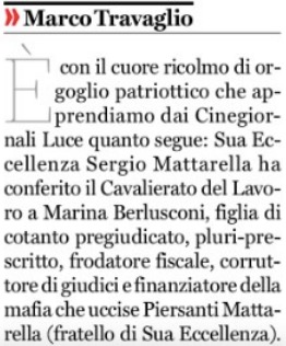 Ecco l’incipit, dopo il titolo, dell’editoriale di Travaglio: “E’ con il cuore ricolmo di orgoglio patriottico che apprendiamo dai Cinegiornali Luce quanto segue: Sua Eccellenza Sergio Mattarella ha conferito il Cavalierato del Lavoro a Marina Berlusconi, figlia di cotanto pregiudicato, pluri-prescritto, frodatore fiscale, corruttore di giudici e finanziatore della mafia che uccise Piersanti Mattarella (fratello di Sua Eccellenza”.