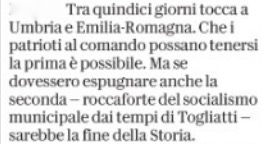 Che “i patrioti al comando” del centrodestra “possano tenersi” anche l’Umbria “è possibile”, ha riconosciuto su Repubblica, appunto, Massimo Giannini, “ma se dovessero espugnare anche la roccaforte del socialismo municipale di Togliatti, sarebbe la fine della Storia”, con la maiuscola. Il rischio evidentemente c’è, nonostante l’ottimismo verbale del “campo largo” dell’alternativa risparmiato da Giuseppe Conte, che non vi ha espulso i renziani, come in Liguria affondando la candidatura di Andrea Orlando alla presidenza della regione sottratta dai magistrati a Giovanni Toti, tenendolo agli arresti, per quanto domiciliari, fino alle dimissioni propedeutiche alle elezioni anticipate.