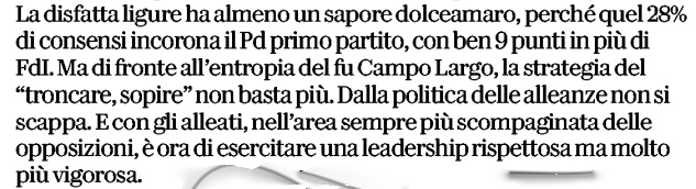 Già, cosa manca dopo che il Pd ha salvato la pelle, diciamo così, nelle elezioni liguri attestandosi al primo posto col 28,5 per cento dei voti, sia pure grazie ad un’affluenza alle urne scesa al 46 per cento? La diagnosi di Giannini è stata alquanto generica, come la terapia, pur dal sapore critico verso la segretaria del Pd trattata con molto riguardo, e persino simpatia, nelle feste annuali “delle idee” di Repubblica.