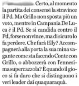 “Certo, al momento -ha scritto Travaglio nel suo editoriale, o mattinale, di giornata sul Fatto Quotidiano- la partita dei consensi la stravince il Pd. Ma Grillo non sposta più un voto, mentre in Campania De Luca è il Pd. Se si candida contro il Pd forse non vince ma sicuro lo fa perdere. Che farà Elly?”.