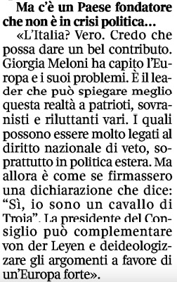 “Giorgia Meloni -ha detto Monti in un altro passaggio dell’intervista- ha capito l’Europa e i suoi problemi. E’ il leader che può spiegare meglio questa realtà a patrioti, sovranisti e riluttanti vari. I quali possono essere molto legati al diritto nazionale di veto, soprattutto in politica estera. Ma allora è come se firmassero una dichiarazione che dice: Sì, io sono un cavallo di Troja. La presidente del Consiglio può complementare von der Leyen e deideologizzare gli argomenti di un’Europa forte”.