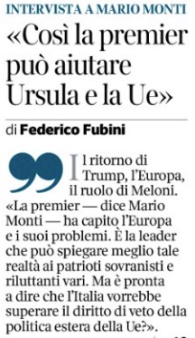 Ancora sulla premier italiana, ma entrando sottilmente in una dialettica fra la competizione e il disturbo esistente nella maggioranza di centrodestra, Monti ha detto che la “operazione” di rafforzamento dell’Europa per confrontarsi meglio con Trump e collaborare “non la può fare Matteo Salvini, la può fare Antonio Tajani ma quella meglio posizionata è Meloni”.