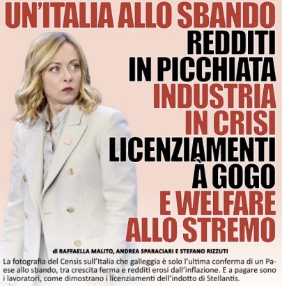 Scritto a tre mani, il resoconto della ricerca di Giorgio De Rita viene più dettagliato e attualizzato nel sommario così: “La fotografia del Censis sull’Italia che galleggia è solo l’ultima conferma di un Paese allo sbando, tra crescita ferma e redditi erosi dall’inflazione. E a pagare sono i lavoratori, come dimostrano i licenziamenti dell’indotto di Stellantis”.