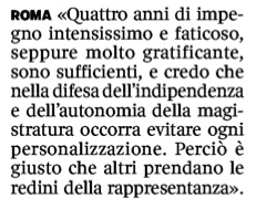 Mi colpisce di più il pur meno vistoso annuncio sulla prima pagina del Corriere della Sera riguardante l’associazione nazionale dei magistrati. Il cui presidente Giuseppe Santalucia ha deciso di lasciare, di non riproporsi alla imminente scadenza del suo mandato quadriennale.