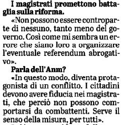 I magistrati sul piede di guerra “non possono essere controparte di nessuno, tanto meno del governo. Così come -ha aggiunto Violante- mi sembra un errore che siano loro a organizare l’eventuale referendum abrogativo”, anch’esso minacciato contro la riforma. “In questo modo -ha aggiunto Violante parlando sempre dell’associazione dei magistrati -diventa protagonista di un conflitto. I cittadini devono avere fiducia nei magistrati, che perciò non possono comportarsi da combattenti. Serve il senso della misura, per tutti”.