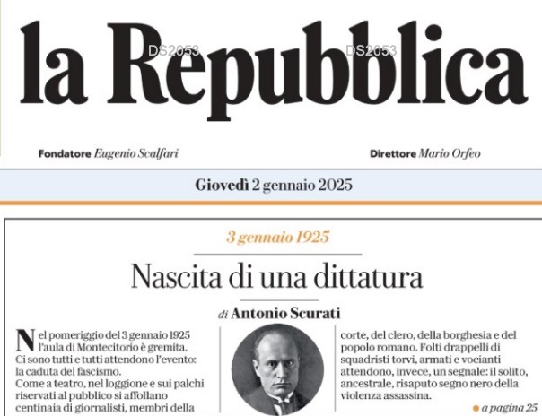 Che tempistica, signori. Il presidente Sergio Mattarella apre in anticipo nel suo decimo messaggio televisivo di San Silvestro a reti unificate -pur nell’apparente disattenzione dei cronisti e persino dei commentatori- le celebrazioni degli 80 anni dalla Liberazione e oggi la Repubblica, quella di carta, torna nelle edicole riesumando dagli archivi la foto del discorso di Benito Mussolini del 3 gennaio 1925, cento anni fa, per ricordare con la firma di Antonio Scurati “la nascita di una dittatura”. Latente, diciamo così, dalla marcia su Roma del 1922 ma poi esplosa, sfacciatamente vantata da Mussolini assumendosi la responsabilità del delitto Matteotti, compiuto dai suoi sicari il 10 giugno 1924.