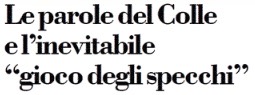 Il guaio di questo che sarei tentato di chiamare il tradizionale, ormai, gioco degli specchi attorno al Capo dello Stato, e ai suoi interventi, è che qualcosa alla fine resta, nell’immaginario politico., delle rappresentazioni finalizzate al perseguimento degli obiettivi di chi si spinge troppo oltre nelle interpretazioni. E nello stesso racconto. E ciò a detrimento, a mio avviso, della Politica, con la maiuscola. E della dialettica che l’accompagna e la caratterizza e si traduce prevalentemente in lotta. Nella quale invece dovrebbe essere interesse di tutti di non coinvolgere una figura di garanzia come quella del Capo dello Stato.