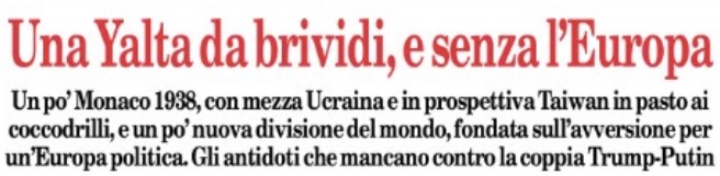 Per Giuliano Ferrara non saremmo solo, a 87 anni di distanza, ad una replica della conferenza di Monaco dove francesi e inglesi alimentarono anziché ridurre il tragico appetito di Hitler, ma andiamo dritti verso “una Yalta da brividi, e senza l’Europa” per un’altra spartizione del mondo. Che finirà per estendersi anche all’Asia con la cessione di Formosa alla Cina. Mancano “antidoti”, secondo Ferrara, alla “coppia Trump-Putin”.