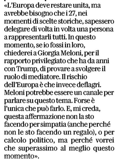 “In questo momento se io fossi in loro -ha detto Crosetto, in particolare, a Repubblica, dopo avere rilevato la necessità o opportunità che i 27 paesi dell’Unione trovino “di volta in volta una persona” cui delegare la loro rappresentanza- chiederei a Giorgia Meloni per il rapporto privilegiato che ha da anni con Trump, di provare a svolgere il ruolo di mediatore”. “Il rischio dell’Europa è che invece deflagri”, ha avvertito il ministro della Difesa guardando o pensando a Bruxelles.