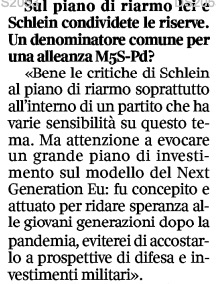 In particolare, Conte si aspetta ora da Schlein un’opposizione più chiara al “grande piano di investimento” pensato in Europa “sul modello del Next Generation Eu”. Che fu “concepito e attuato per ridare speramza alle giovani generazioni dopo la pandemia”. “Eviterei di accostare -ha detto il presidente pentastellato- le prospettive di difesa e investimenti militari”. Cioè, la difesa e gli investimenti militari sarebbero politicamente inconciliabili in una visione del mondo alla rovescia o sottosopra, questa volta di Conte, dopo le edizioni giù ricordate di Trump e Vannacci.