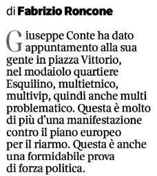 Mao diceva che “grande è la confusione sotto il cielo”, ricavandone ottimismo per sé stesso. Qui, per stare all’immagine più casereccia di Roncone, grande è “il casino” delle opposizioni pur festosamente sfilate per le strade di Roma. Di cui lo stesso Roncone solo qualche giorno fa, prima di distrarsi un po’ seguendo e ascoltando il Conte dell’Esquilino e dintorni, aveva scrupolosamente elencato incidenti e contraddizioni in sole tre settimane di votazioni fra Parlamento europeo, Parlamento italiano e piazze sui temi non da avanspettacolo come sono quelli della difesa e della sicurezza. Che non possono essere appesi come caciocavalli a un so