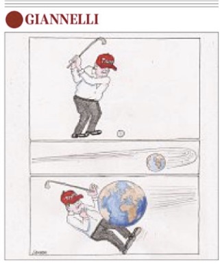 Un Emilio Giannelli particolarmente in forma con la sua matita di vignettista, senza aiuto alcuna del’intelligenza artificiale sbarcata anche in qualche giornale, ha inchiodato, trafitto, ridicolizzato e quant’altro il presidente americano Donald Trump sulla prima pagina del Corriere della Sera con una pallina da golf. Che, tirata nella solita posa di giocatore ricco e professionale, gli torna addosso nelle dimensioni e forme del globo terracqueo. Quello che lo stesso Trump vorrebbe mettere sottosopra con i dazi e con i suoi rapporti più o meno privilegiati con la Russia di Putin, costretta paradossalmente più di tre anni fa a difendersi dall’Ucraina, secondo le ricostruzioni recentissime della Casa Bianca, invadendola e cercando, sinora inutilmente, di ammazzarne o metterne in fuga il presidente Zelensky. Che sarebbe di scarso successo anche come attore, come disse di lui il presidente americano di riceverlo e strapazzarlo in diretta televisiva mondiale.