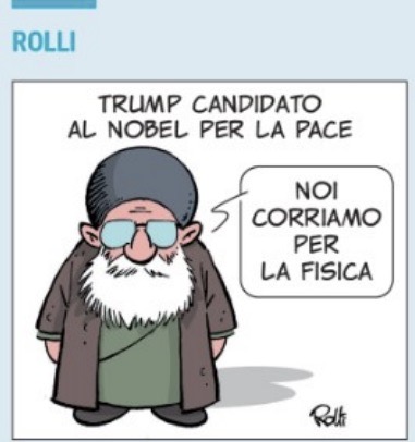 Stefano Rolli, il vignettista del Secolo XIX, è stato il più sarcastico commentando a suo modo la candidatura di Trump al premio Nobel- ripeto, della pace- accoppiata a quella del capo supremo ayatollah dell’Iran al premio Nobel della fisica. Quella atomica.