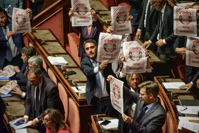 Quelle locandine sventolate dai banchi delle opposizioni sulla Costituzione rovesciata dovevano accompagnare solo il secondo passaggio parlamentare -ripeto- della riforma che, fra l’altro, separa le carriere e i Consigli Superiori della Magistratura giudicante e inquirente Invece hanno accompagnato anche, per circostanze di tempo volute dalla magistratura inquirente, l’azione giudiziaria appena promossa contro l’eurodeputato del Pd ed ex sindaco di Pesaro Matteo Ricci mentre cominciava la sua corsa ufficiale a presidente della regione Marche.
