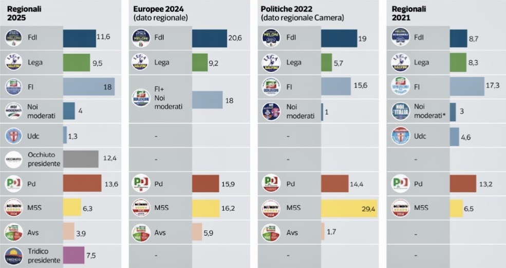 E Conte, l’ex presidente del Consiglio ancora nostalgico di Palazzo Chigi e adesso solo presidente di quel che resta del movimento già di Grillo? Da lui è arrivato solo un ringraziamento al fedele Tridico, evidentemente per non avere fatto scendere le 5 Stelle al 5 per cento come nelle Marche ed averne fermato la caduta al già ricordato 6,3.