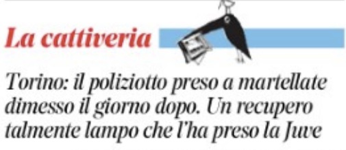 Ma sentite, anzi leggete quel che si è scritto nella “Cattiveria” di giornata – le virgolette del titolo sono mie- di quel poliziotto picchiato a martellate dopo essere stato atterrato, prima di finire al pronto soccorso: “Torino: il poliziotto preso a martellate dimesso il giorno dopo. Un recupero talmente lampo che l’ha preso la Juve”. Che potrebbe magari allenarlo e tenerselo come riserva nel ruolo di portiere. Alla faccia dell’umorismo.