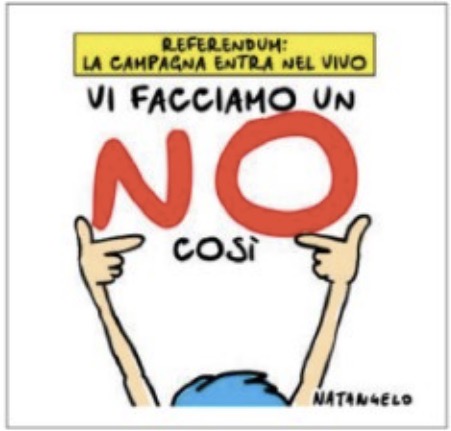 Analoga promessa fu fatta nella campagna elettorale del 1948, con parole più esplicite della vignetta di Natangelo, dal capo del Pci Palmiro Togliatti. Il “NO” di allora era il deretano del presidente del Consiglio Alcide De Gasperi, che per reazione alla volgarità aggressiva del segretario del Pci raccolse non una “pioggia” ma “un diluvio” di voti, come disse lo stesso De Gasperi con un misto di compiacimento e di sorpresa.